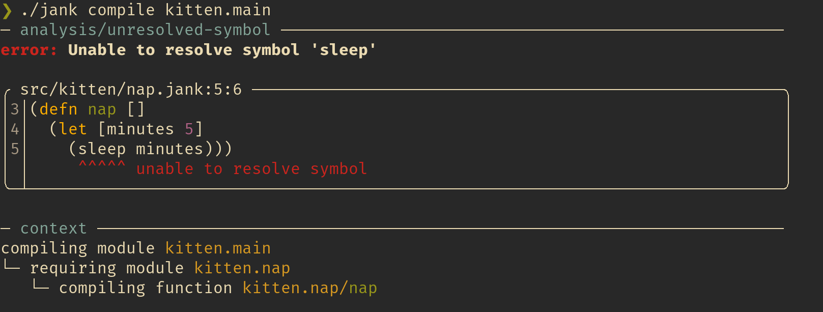 jank stands in its own category among lisps for its error reporting quality. No bloated JVM stack traces, opaque errors, or lack of context.